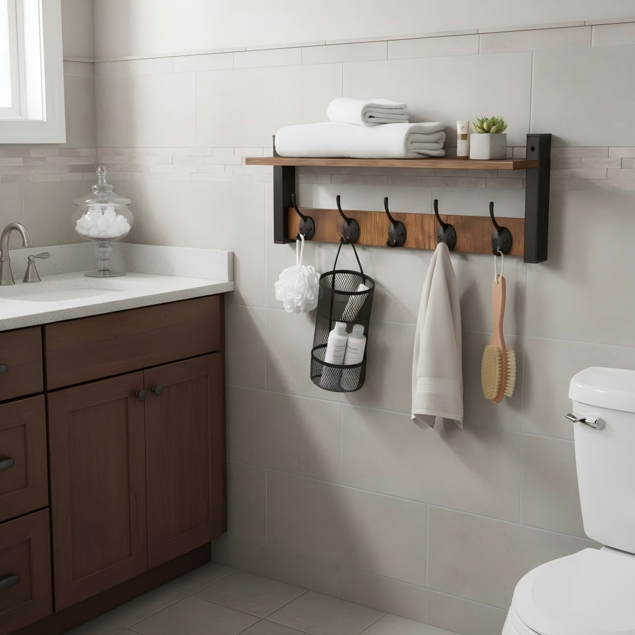 【Sturdy & Stylish Design】Crafted from MDF and reinforced with metal brackets, this wall-mounted shelf features five hooks, offering durable, rustic charm that's perfect for modern farmhouse or industrial decor. Ideal for entryways, hallways, garages, or mudrooms.